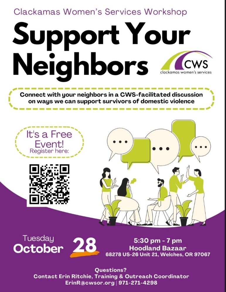 Clackamas Women's Services is facilitating a Support Your Neighbors workshop and conversation to discuss how we can support domestic violence survivors in our lives and create a safer community together.
